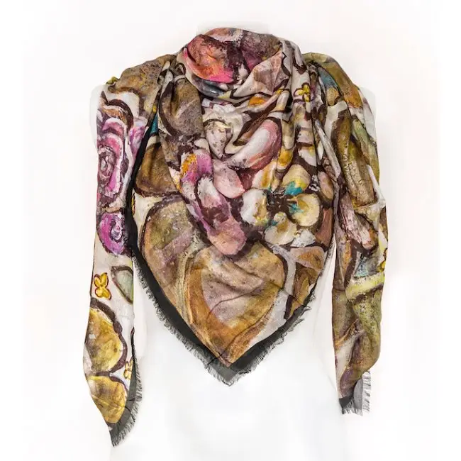 This designer scarf is based on an original painting by Shadi Mahsa, blending the essence of spring florals and abstract artistry into a luxurious accessory.