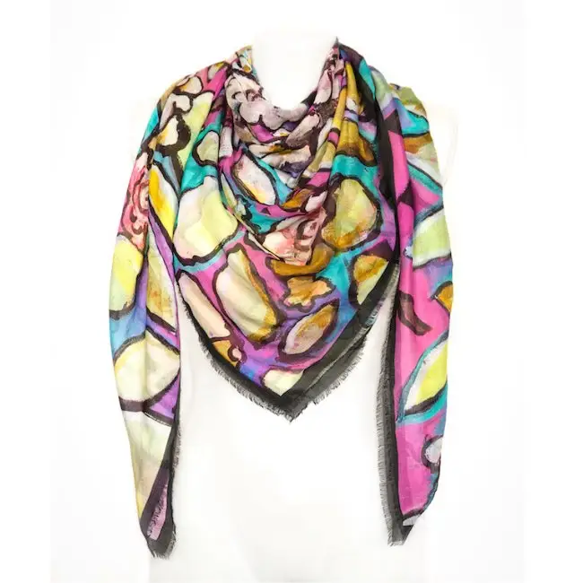 The 100 x 100 cm size allows for multiple styling options—wear it as a colourful neck scarf, an artistic shawl, or a playful wrap.
